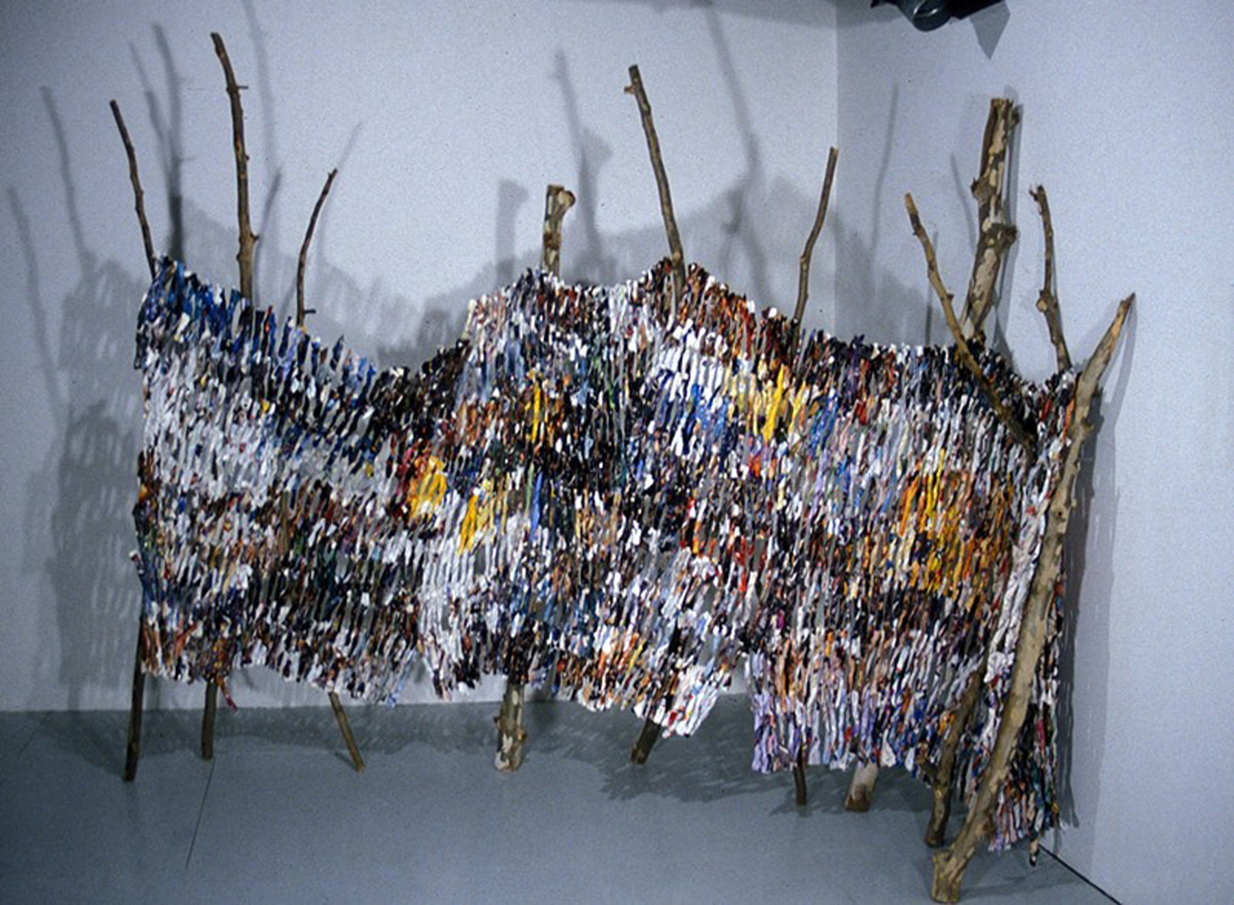 Fence II. Magazine pages and wood. 8'x13'x2'. 2004