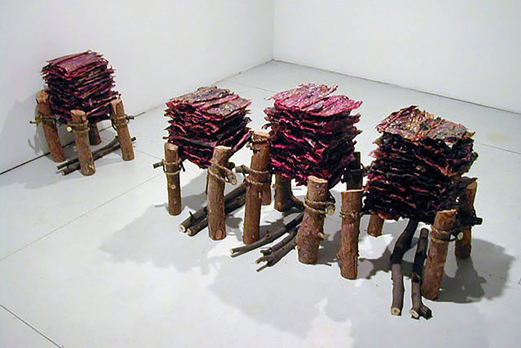 Stools. Yellow pages, wax, sticks and rope. 2'x9'x2.5'. 2005